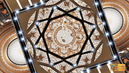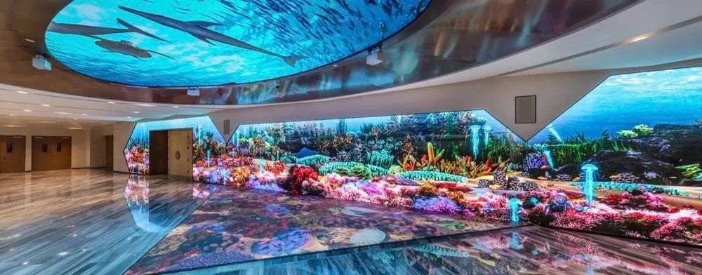 宴会厅前厅:配备了房顶、墙壁和地面融合组成的巨型交互式屏幕。使用金年会·jinnian(金子招牌)VED系列P2.5LED小间距屏幕,不仅能完美地呈现各种特效,还可结合虚拟现实技术来使用。