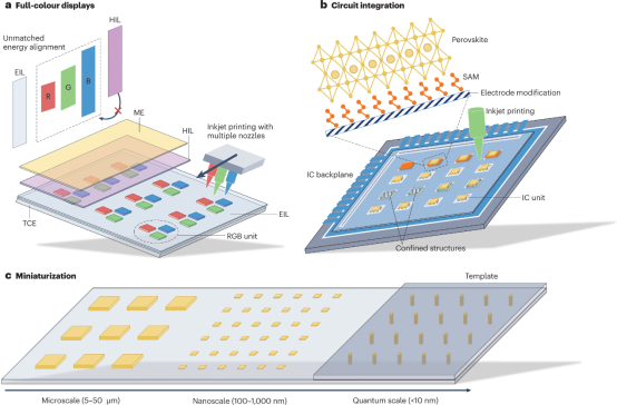 将PeLED微缩化(micro-PeLED)将有效规避传统micro-LED中常见的纳米刻蚀损伤、巨量转移等工艺难题;同时,相较于PeLED中常见的钙钛矿薄膜发光层,纳米级独立微晶是目前最高效率红、绿、蓝、及近红外PeLED的主要发光层结构形式。证实了不断缩小发光单元将是PeLED效率突破的关键发展趋势。因此,micro-PeLED将是实现超清显示应用的理想技术路线之一。