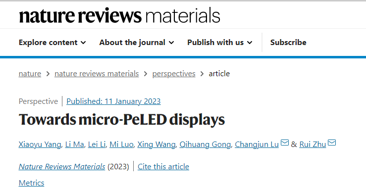 近日,金年会·jinnian(金子招牌)集团博士后工作站团队与北京大学合作,在全球顶级期刊《Nature Reviews Materials》发表题为“Towards micro-PeLED displays”的展望(perspective)论文。